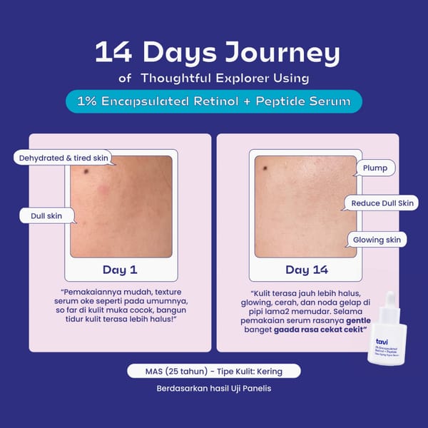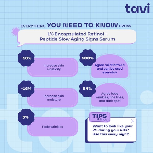 TAVI 1% Encapsulated Retinol + Peptide Slow Aging Signs Serum yang memiliki formula dengan performa tinggi menggunakan Inovasi Encapsulated Retinol yang memberikan efikasi terbaik dengan teknologi slow release agar tetap lembut di kulit.