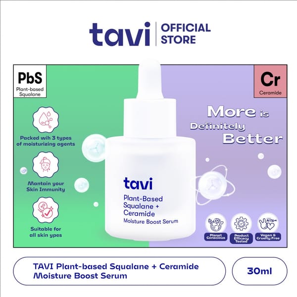 - Tavi Plant-based Squalane + Ceramide Moisture Boost Serum, hidrasi lengkap untuk kulit sehat sepanjang hari yang dikemas dengan 3 jenis bahan pelembab: