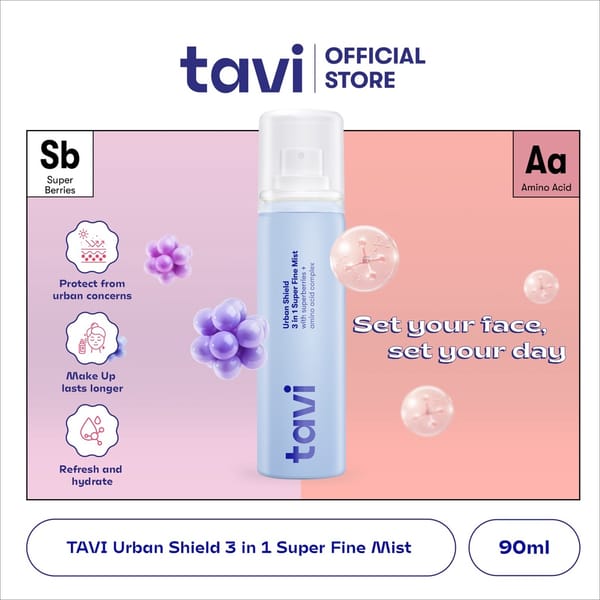 TAVI Urban Shield 3 in 1 Super Fine Mist mengandung Superberries (Goji, Acai, dan Japanese Beauty Berry) + Amino Acid Complex untuk melindungi kulit dari masalah urban (polusi debu, asap, partikel kotoran, dan bluelight) , sekaligus membantu prime & set makeup, serta menghidrasi kulit dan menyegarkan kulit.
