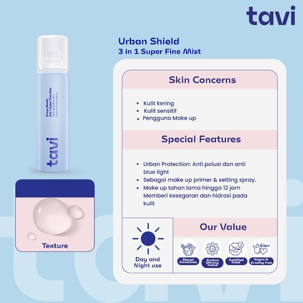 TAVI Urban Shield 3 in 1 Super Fine Mist mengandung Superberries (Goji, Acai, dan Japanese Beauty Berry) + Amino Acid Complex untuk melindungi kulit dari masalah urban (polusi debu, asap, partikel kotoran, dan bluelight) , sekaligus membantu prime & set makeup, serta menghidrasi kulit dan menyegarkan kulit.